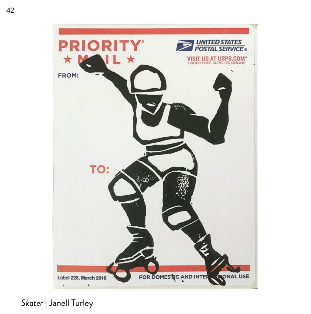 In my years living in Van Nuys, I always felt the most community and belonging when I was rollerskating. VLY GRL is a love letter to the San Fernando Valley, created to smash the bimbo Valley Girl stereotype. My featured piece is a Linocut print of a badass rollerskater on USPS shipping label.